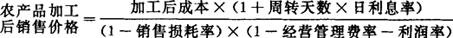 释义 | 农产品简单加工后销售价格 指某些农副产品在收购后,经过简单加工的销售价格。 其计算公式为: 例如,收购生猪屠宰后出售,其销售价格就应按上述公式计算。其中,猪肉加工后成本应包括:生猪收购价格、市场管理费、短途集中运杂费、饲养保管费、检验费、屠宰加工费、宰前损耗、冷冻费、屠宰场经营管理费、屠宰税金及减去猪副产品和其它回收价值。 |