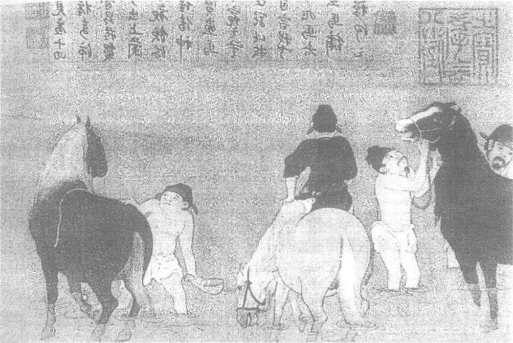 释义 | 赵孟頫《浴马图》 赵孟頫《浴马图》绢本,设色,纵28.1厘米、横155.5厘米。现藏北京故宫博物院。画面描绘了骏马十四匹,分黑白灰褐花斑诸色; 奚官九人。盛夏郊外,溪流潺潺,清澈透底。马或饮水、或卧岸边、或引颈嘶鸣、或昂首顾盼,姿态各异; 奚官或骑马上张望、或为立水中的马洗刷、或驱马上岸、或跨马下水、或牵马准备下水,动态多样。岸上绿茵如席,梧桐垂柳,婀娜多姿。环境清爽怡人。在技法方面,此画用工笔重彩,“刻意学唐人”,线条圆润,皴染简练,设色浓丽。形象刻划严谨认真,对马的形体质感、溪水的清澈、人物的正侧向背、坐 卧立走等姿态,以及岸上的树木的枯嫩、草丛花竹等形象,都认真描绘,一丝不苟。 赵孟頫 《浴马图》 赵孟頫(1254~1322),字子昂,号松雪、鸥波、水晶宫道人。谥文敏。湖州(今浙江吴兴)人。宋宗室后裔——宋太祖赵匡胤十一世孙。入元后,经程钜夫推荐,在朝为官,“被誉五朝 ,官居一品,名满天下。”官至翰林学士承旨。赵孟頫多才多艺,诗文书画、音乐琴棋均有较高造诣。其中尤以书画成就最高,影响深远,为后人所称道。实为开元代书画新风的领袖人物。他在书法方面,篆隶真行草无一不精,在绘画方面,山水、人物、花鸟、竹石、鞍马无所不能。技法方面,或工或写、或赋色或水墨,样样精通,蜚声中外。其书法融晋唐各家之长,形成以“匀净平顺” 为特色的新书体,与欧、颜、柳并称四大书家。其绘画,开创了元代简率、尚意、以书入画的新的时代风格,使文人画走向全面成熟。对明清书画的发展产生了极为深远的影响。 ☚ 赵孟頫《红衣罗汉图》 永乐宫壁画《飞天》 ☛ |