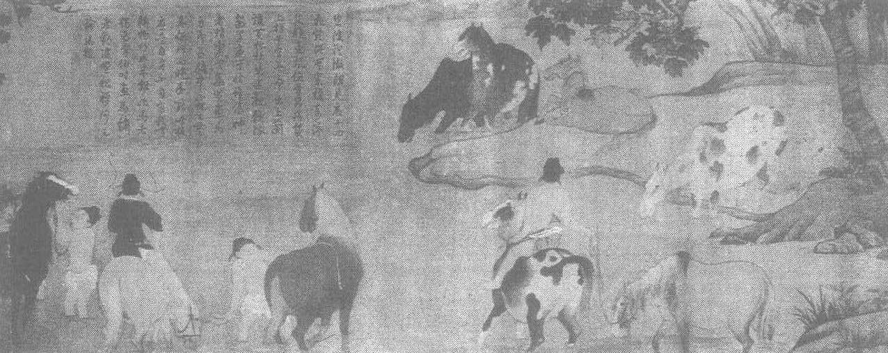释义 | 赵孟頫浴马图卷 赵孟頫浴马图卷元。赵孟頫(见《赵孟頫秋郊饮马图卷》条目)绘。绢本设色。纵28.1厘米,横155.5厘米。北京故宫博物院藏。图中一湾溪水清澈见底,两岸绿草如茵,杂生几杆芦苇。梧桐、垂柳叶色浓郁,翳荫蔽日,不见一丝风动的迹象。光色明朗,显示出一幅夏日正午的景色。14匹骏马,颜色不一,分黑、白、灰、褐、花斑诸种,膘肥体壮,有的饮水,有的嘶鸣,有的卧在岸边,有的立于溪中,俯仰顾盼,神态各异。九个奚官或少或长,多数人脱去了官服,赤膊下水。一些人刷洗马身,另一些人则骑在马上趟水而行,还有的人在树下纳凉,一个老者衣装齐整地牵马走向水边。画面形象左右呼应,动静结合,用笔工细,线条圆劲,色彩鲜明,风格秀丽,有唐人遗风。画中款署:子昂为和之作。下钤〈赵氏子昂〉、〈松雪斋〉印。引首有清乾隆帝题:“青溪龙跃”四字。卷尾有明人王穉登、宋献题跋。经由明王穉登,清高士奇及清内府收藏。《江村销夏录》、《石渠宝笈续编》、《式古堂书画考》著录。 ☚ 赵孟頫秋郊饮马图卷 赵孟頫人骑图卷 ☛ |