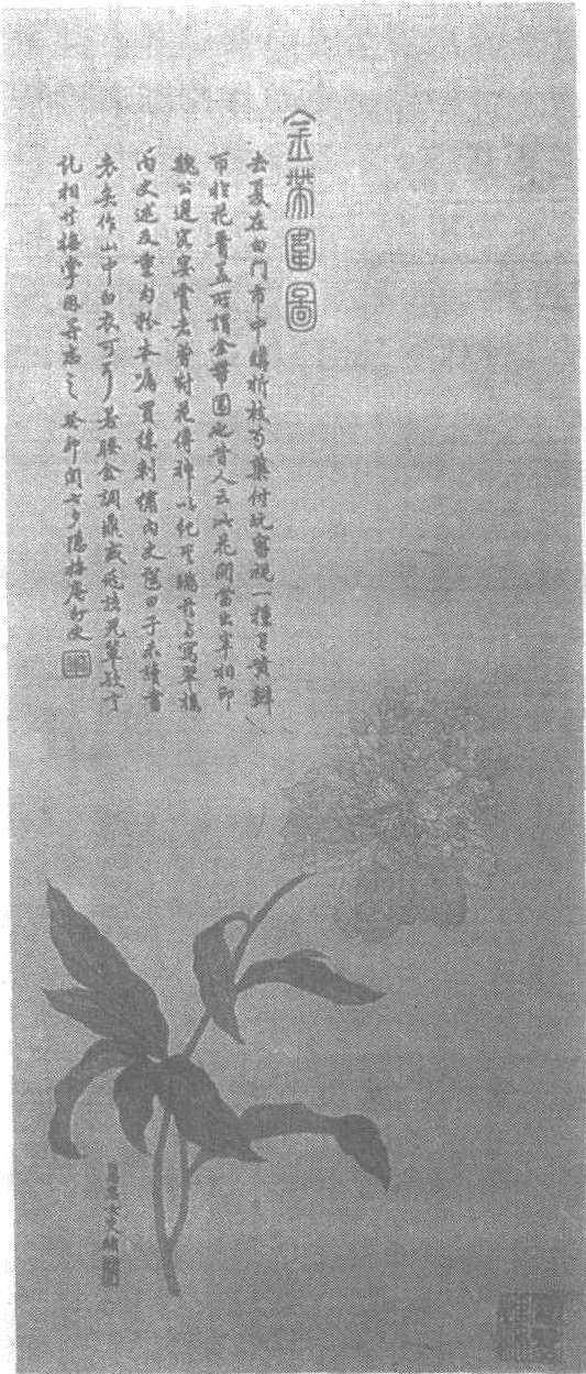 清。纵70.5厘米,横28.8厘米。上海博物馆藏。以白缎为地,上绣有一束折枝芍药,花梗盘延向上,花叶略有萎谢,黄中泛青,其花争奇斗艳,花蕊粉红,金黄色线勾勒出花瓣的边缘。上绣款<慧君女史绣>和<印珠>、<写翠楼>印各一方。左上方有墨丝绣顾春福的“金带围图”题句,讲述宋代的魏国公韩琦任广陵太守时,郡圃开了四枝芍药,韩琦请了王珪、王安石、陈升之共宴欣赏,后来四人均为宰相。因此,“金带围”被认为是芍药花的一种,是一种祥瑞花卉,在传统工艺中常以此为题材。左上方有墨丝所绣顾春福的署款<隐梅庵外史>以及<春福>一方印。此绣细线精工,运针纹理舒展,用擞和针绣制晕色红花、绿叶和花梗,齐针绣字和印章,极尽艺术风采,是清代刺绣中的佳作。赵慧君,女,生卒不详,别名慧君女史,江苏昆山人,清道光时画家顾春福的妻室。善绣山水、人物,所绣作品色丝艳丽,一如图画。张愿令称其作品:“画韵针神,可称双绝。”