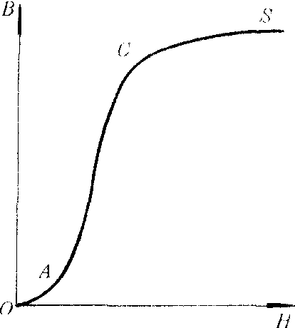 释义 | 起始磁化曲线 起始磁化曲线qishi cihua quxian铁磁质从完全未磁化状态(M=0,B=0,H=0),在方向不变数值作单调增加的磁场中磁化直至达到饱和状态过程中磁化强度M或磁感应强度B与磁场强度H的依赖关系的曲线(M—H曲线或B—H曲线)。由于铁磁质中一般M比H大得多(102~106),所以B=μ0(H+M)≃μ0M,因此B—H曲线的形状与M—H曲线的形状差不多。起始磁化曲线是过原点的非线性曲线(见图),B(或M)随H增大而增大,铁磁质中M的值一般远大于弱磁性物质中M的值,而且M很易达到趋近饱和状态。如图示 出了铁磁质的B—H曲线,其中的OA段B随H增长较慢,AC段B随H增大迅速增长,以后B的增长又趋缓慢。从S点以后B几乎不随H增大而增大了,此时M也几乎不随H增大而增大了。从S点开始称磁化达到了饱和,S点称饱和磁化状态。把与曲线上S点对应的磁场强度称为饱和磁场强度,记作Hs;相应的磁感应强度称为饱和磁感应强度,记作Bs;相应的磁化强度称为饱和磁化强度,记作Ms。不同的磁性材料起始磁化曲线形状不同。 起始磁化曲线在选材上是很有用的。由于软铁磁质的磁滞回线窄长可用起始磁化曲线来近似代替它,由曲线可求得曲线上各点对应的磁导率(μ=B/H),也可求出起始磁导率μ1及最大磁导率μM,据此进行材料选择。例如用在电子、电讯设备中的软磁材料,由于其铁心线圈中的电流很小(弱电情况),铁心的工作状态处于起始的一段磁化曲线上,因此应当选用起始磁导率μ1大的磁性材料。而对于用在电动机、发电机、变压器上的软磁材料,由于其铁心线圈中的电流很大(强电情况),铁心工作状态接近于其饱和情况,因此应当选用最大磁导率μM大的材料。 ☚ 软磁材料 饱和磁化强度 ☛ |