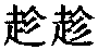 【提示】走,上面是土,下面是龰, 不是一竖到底。 *趁〔趂〕chèn12画 走部 (1) 〈方〉赶;赴: ~墟(赶集)。 (2) (及时)利用机会,不放过: ~机|~火打劫|~着天还亮,再走一段路。 (3) (趁便)搭乘: ~车|~船。 (4) 〈方〉富有: ~钱。 趁趂chèn古代形声字。从走,㐱(zhěn)声。 本读zhēn,用于趁𧾍(-zhān),行路不前进的样子。异体作趂,在书法中㐱旁有时变形作“尔”(不是尔我的尔)。引申为利用机会。如:趁热打铁|趁着没下雨打场(cháng)。再引申为顺便搭乘。如:趁车。 趁★常◎常