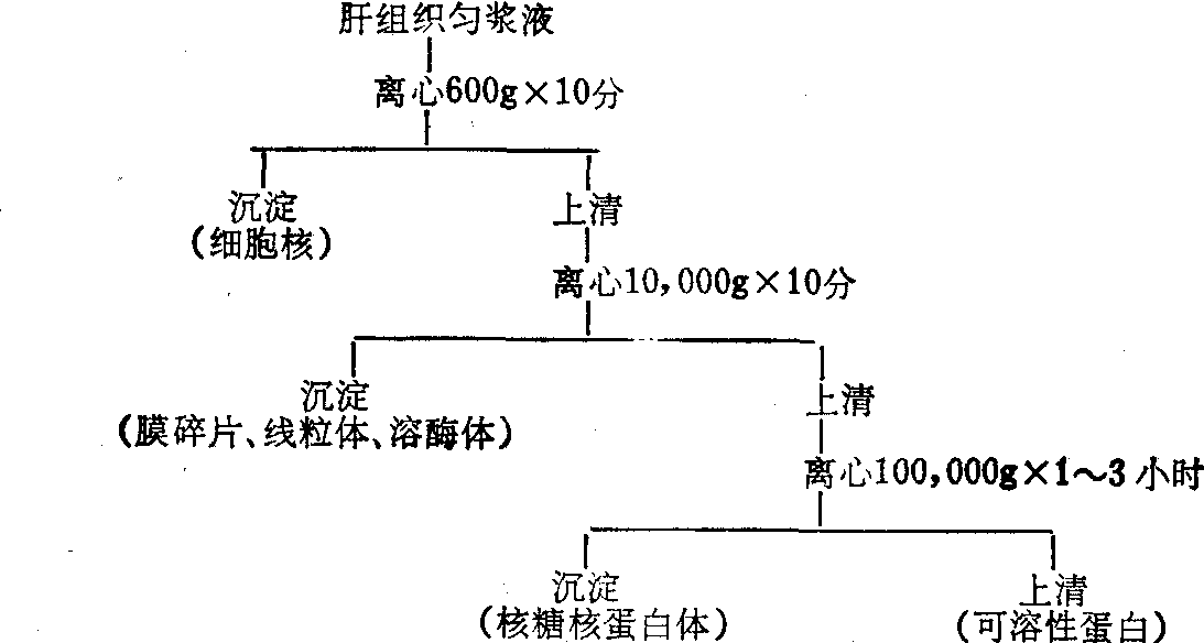 表中Schlieren光学系统测定的是溶液中折射率梯度(或浓度梯度)随r(距离转动中心的距离)的变化。干涉光学系统通过计数干涉条纹的数目来测定溶液中浓度c随r的变化。紫外吸收照相或紫外光电扫描光学系统测量的是溶液对紫外光的吸收值(或透光值)对r的变化。 近年来除对离心机和转头的寿命、温度系统、机械和电子线路包括各种安全控制系统等改进外,还采用了激光光源,微处理机控制和计算机联用等新技术,使其安全性、可靠性和自动化程度都有提高。除设计了专用的特殊转头外,在临床上还发展了离心分析器及可用来分析血清脂蛋白的“空气离心机”。 超速离心机主要用来分离和纯化生物大分子(蛋白质、酶、核酸)、病毒、细胞及细胞器等; 分析和鉴定其纯度或浓度、其分子量或分子量分布、浮力密度; 研究大分子的形状及大分子之间或大分子和小分子的相互作用。 基本原理 在重力场中,在距转动中心r (cm)处的加速度a=ω2r,其中ω为角速度,ω=2πn,n为每秒转数。离心时的离心加速度通常都用地球重力加速度(g)的倍数表示,如离心机每分钟转速为RPM,则其加速度a为: a=1.118×10-5×(RPM)2×r 沉降系数s系表示颗粒或大分子在单位力场下的移动速度,即s=(dr/dt)/ω2r。如牛血清白蛋白的沉降系数为4.6×10-13秒。由于其移动速度很小,故定义1×10-13秒为1个Svedberg单位(1s),则上述白蛋白的沉降系数即为4.6s。若大分子的密度低于溶剂的密度(如脂蛋白)则称为漂浮系数,用sf表示。 一种物质的沉降系数除与该物质的大小、形状、密度有关外,还与其水化程度,所用溶剂的密度和粘度等有关,而且不同浓度的样品所测得的沉降系数也不同。为此,将在标准溶剂中(20℃,水),于理想情况下(浓度为零) 的沉降系数称为该物质的沉降常数,用s020,ω表示,它是通常由几个不同浓度下测得的s020,ω值外推至零浓度而求得的。在不同条件下测得的sCT值校正到标准条件的公式为: 超离心技术的基本方法和应用 最常见的有以下三个方面: (1) 差速离心法: 混合物中如有沉降速度不同的颗粒存在,纯化其中的一种颗粒时,可先低速离心除去大的颗粒,再高速离心以除去小的颗粒。这种通过反复的高、低速离心纯化物质的离心方法叫做差速离心法。此时总的回收率为Pn (1-Pn),其中P为高速离心时沉淀中保留该物质的百分数,P′为低速离心时沉淀中保留的百分数,n为离心的次数。当两个颗粒的沉降系数差一个数量级以上时,用这种方法,能取得好的分离效果。图1所示为制备细胞中各组分的离心条件。 (2) 沉降速度法和沉降平衡法: 当颗粒在离心场中移动时,按公式 ![]() 当物质在离心场中长时间离心后,其沉降速度与扩散速度达到平衡,即池中各点没有物质的净转移。此时可以通过该物质浓度的分布来计算其分子量,此种方法称 图1 制备细胞各组分离心条件 为沉降平衡法。分子量计算如下式所示:(3) 密度梯度离心法: 在密度梯度离心中,溶剂(或称介质)的密度随离心半径的增加而增加 (即形成密度梯度),故称密度梯度离心。离心结束后,密度不同的大小颗粒或大分子分布在不同的区带上,所以此法也叫区带或带形离心法。这种方法的分辨力好,可比差速离心法提高1~2个数量级。它处理的样品量大,且不象差速离心法那样形成沉淀,因为有了梯度使样品得以稳定并能减小对流和扰动的影响,