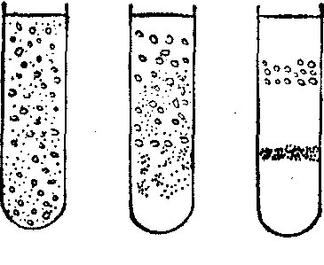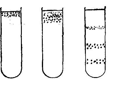 图2 三种大小不同的颗粒速度区带离心示意图 在密度梯度离心中可根据颗粒的大小或密度 (浮力密度) 的不同达到分离的目的。此种主要根据颗粒大小(沉降速度)不同达到分离目的的叫做速度梯度离心法(图2)。因为在梯度溶液中,随着离心半径的增加,梯度溶液的密度和粘度都有变化,所以,可用下式计算沉降系数: ![]() 主要根据颗粒在介质中浮力密度不同而使之相互分离的称为等密度梯度离心(图3)。在密度梯度中达到