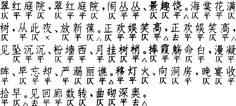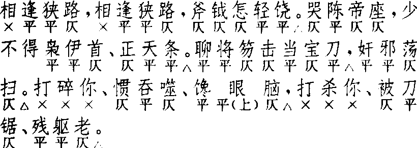 释义 | 越恁好 越恁好李玉 《清忠谱》 ![]() 全曲九句:4,叠4,5△。4,6△。7△,4△。9△,9△。 其二 袁于令 《西楼记》 ![]() 全曲十四句:4,(叠)4,6△。5,6△。5△,(叠)5△,10△。5,10△。6,5△。5,4△。此曲二式,除起句外,绝少相同之处。第一式用于〔粉孩儿〕套,第二式用于〔泣颜回〕套,亦很少相混。《南词简谱》谓:第一式“用在情节急遽时”,第二式“为叠字格,用在排场热闹时”。第一式第七句有不叶韵者,如《白兔记·成婚》、《杀狗记·夫妇叩窑》,盖早期体式,后未见用者。第二式第四、六、九句均为上一下四式五字句,第九句亦可叠用。第二式多用叠字,如《南柯记·侍猎》、《昙花记·仇邪设诱》、《玉合记·宸游》、《龙膏记·偿缘》,以渲染热闹气氛。《清忠谱·戮义》少作末四句。〔越恁好〕还有一种用法,即用于传奇最后一出收场,词式多异,较第一式简化,不详述。第二式一名〔走山画眉〕。 ☚ 千秋岁 红绣鞋 ☛ |