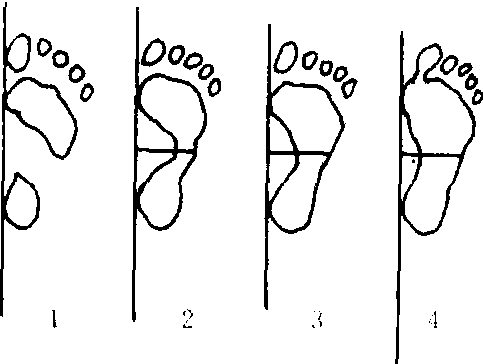 足弓的检查通常是用印迹法。先用滑石粉涂在受试者的足底,然后将足踏在橡皮布或黑板上,即印下受试者的足印。然后从𧿹趾和足跟的内侧缘连一条切线,再从此线的中点向足印外侧缘中点划一条横线,如果空白部分与有足印部分的比例在2:1以上则为正常足弓;若为1:1则为轻度平足;若为1:2以上则为重度平足。