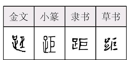 jù形声,从足,巨声,本义为鸡、雉等爪后边突出像脚趾的部分,引申为离开(在空间或时间上相隔)、相隔的长度等。 【辨析】 距/拒 见208页“拒”。 |