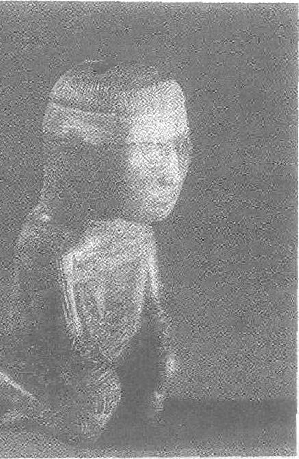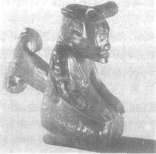 释义 | 跪式玉人 跪式玉人商。高8.5厘米。1976年河南省安阳市殷墟妇好墓出土。北京中国社会科学院考古研究所藏。体为褐色,面呈淡绿色,为一圆雕跪坐像。头和颈在通体中所占比例较大。身体略前倾,头微低,脸庞较圆,平眉,臣字形目,小口,两耳和鼻较大,鼻孔微显。头顶中部梳一小辫下垂至脑后,辫上似缚发绳。身穿窄袖长衣,衣上饰蛇纹与云纹。敞胸,有兽面纹文身。两腿间有一圆孔,可供插嵌。殷墟妇好墓见“殷墟妇好墓”条目。 ☚ 玉扳指 玉立人 ☛ 跪式玉人 跪式玉人商。高7厘米。1976年河南省安阳市殷墟妇好墓出土。北京中国历史博物馆藏。此为黄褐色立体圆雕像,双手抚膝跪坐。长脸尖颌,绳状细长眉,臣字眼,大鼻小口,头梳一条长辫,由头顶盘后脑一周,辫梢和辫根相压于右耳后部。头上戴圆箍形束发器,圆箍前加一卷状饰。头顶露发丝,上有对穿插笄孔,靠前还有一小孔。身着交领窄袖长衣,衣上饰云纹。腹前挂一长条形蔽膝,下缘至膝部。腰束宽带,左侧插一宽柄器,上端作卷云形,一面饰云纹和节状纹。跪式人双目平视前方,嘴紧闭,跪姿端正,神态严肃。此玉雕的制作技艺精湛,所雕人像比例适当,线条简练概括,即使发辫的雕刻也一丝不苟,是商代玉石人像中最精美的一件作品。殷墟妇好墓见“殷墟妇好墓”条目。 ☚ 兽面纹玉簋 玉凤 ☛ |