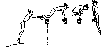 该动作在平衡木项目的上法中属低难度动作,是中国女子少年级体操运动员规定动作图解(1964年版)中一组平衡木的上法,又是女子体操运动员规定动作图解(1980年版)中一级平衡木的上法。由助跑开始,双脚起跳,两臂前伸并用力支撑,肩稍前移,同时含胸,收腹提臀,两腿屈膝迅速引向胸部越过平衡木,当腿过木后两腿向前下方伸直,同时上体迅速抬起,两肩及时后引、抬头、挺胸成后撑。