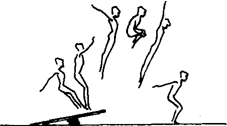 蹬踏弹板,使身体成团身姿势腾空,然后挺身落下的动作。动作要领:起跳后,身体向前上方腾起时,迅速地收腹、屈腿、两手抱膝。当身体接近最高点时,迅速伸展身体,然后落地。保护与帮助:同踏跳挺身跳。教学重点:站在弹板上做跳起收腹、屈腿两手抱膝的团身跳练习,待熟练后加助跑、踏跳做完整动作练习。