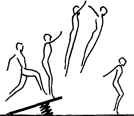 释义 | 踏跳挺身跳 踏跳挺身跳蹬踏弹板,使身体成挺身姿势腾空动作。动作要领:助跑,上板时腿稍屈,两臂由后经下向前上方摆,同时两腿用力伸直膝、髋关节下压弹板,利用弹板反弹力使身体向前上方腾起,两臂侧前上举、梗头、挺胸成挺身姿势,然后缓冲落地。保护与帮助:保护者站在练习者落地点侧面,当其落地时,用手扶其腹背。教学重点:站在弹板上做挺身跳下动作,然后加助跑、踏跳做完整动作练习。 踏跳挺身跳 ☚ 三步上板起跳 踏跳团身跳 ☛ |