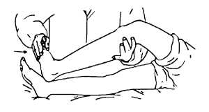 踝阵挛ankle-clonus系一种病理性反射。病人取仰卧位,两下肢弯曲,检查者以左手托腘窝,右手握足,用力将足向背侧伸展,同时用手抵住足底不使其复位,则该足出现连续性伸展运动叫踝阵挛阳性。踝阵挛阳性主要见于锥体束病变。 踝阵挛ankle clonous是腓肠肌与比目鱼肌发生节律性收缩动作的表现。检查时嘱病人仰卧,髋关节与膝关节微屈,检查者一手持病人小腿,一手持病人足掌前端,用力使足掌突然背屈,如出现踝阵挛即为阳性。见于锥体束损害。 踝阵挛 踝阵挛ankle clonus系锥体束病理反射之一。检查时,取病人仰卧位,下肢的髋膝关节稍屈曲,医生一手握住病人小腿,另一手握住病人脚趾,并用力使踝关节背曲,如踝关节出现节律性伸屈运动,即为踝阵挛。见于锥体束损伤。亦见于中枢神经系兴奋性亢进和神经官能症。锥体束病变踝阵挛较持续。而后者多呈对称性和短暂性。 .jpg) 踝阵挛检查法示意图
