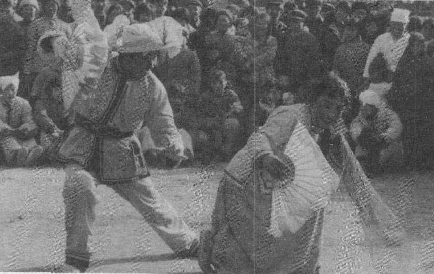 踢场子 踢场子传统用语。武艺高强者,通过亮艺或较艺的方式,迫使摆场子一方收场。 ☚ 打场子 拳场 ☛ 踢场子陕北民间舞蹈。多以一男一女对舞的二人场子为主,也有一男两女表演的三人场子和多人表演的集体形式。踢场子中的女角称“包头”,男角称“挎鼓子”。两人在唢呐锣鼓的伴奏中,通过嬉戏逗耍表现男女之间的欢快和喜悦。以抒情格调为主的称“软场子”(又称文场子); 动作粗犷具有民间摹术风格的称“硬场子”(又称武场子);表演诙谐、风趣滑稽的称“丑场子”(又称老人场子)。踢场子动作丰富,舞姿婀娜,节奏欢快,情绪活泼。其中“三脚不落地”、“凤凰展翅”、“金鸡独立”、“跌软腰”等动作,形成了独特的表演风格和地域特色,成为当地群众春节闹秧歌时最受欢迎的节目之一。