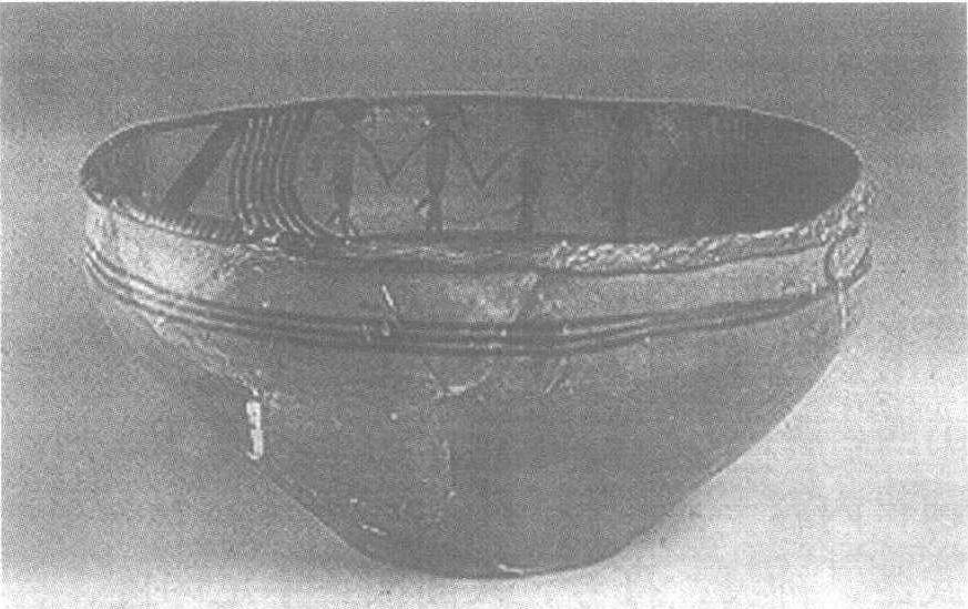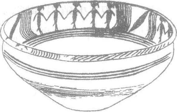 这是在青海大通上孙家塞出土的一件珍贵文物。在陶盆内沿画着一圈三组集体舞蹈,每组五人,手挽着手,头转向右侧,脑后飘垂着发辫和带子,双腿似向相反的左侧舞动,下身右侧斜出尾饰。每组人形纹用七八条下垂的弧线隔开,像是飘动的柳条。人物站在四条平行圈带纹上,脚踩的一条最粗,其余较细,像是水边草地的平面图案。透过这一画面,人们似乎可以从中想象出生活在黄河岸边的原始先民载歌载舞欢庆丰收或祭祀神灵的生动情景。这组以彩陶纹饰出现的图画,笔墨精炼到极点,但我们仍不难体察到一种原始生活的自然、欢乐、质朴纯真的气息。