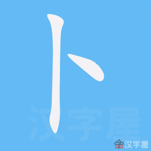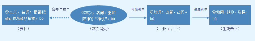 字源解说 本 字“卜” 卜,甲骨文 、 像树杈。造字本义:巫师作为降神道具的“神杖”。金文 、篆文 基本承续甲骨文字形。 合并字“蔔” “蔔”是形声字。“匐”是声旁,“卄”是形旁,表示与植物有关。造字本义:一种植物,花为白色至紫色,末端为总状花序,根部肥硕可作蔬菜。 附 文言版《説文解字》:卜,灼剥龜也,象灸龜之形。一曰象龜兆之從橫也。凡卜之屬皆从卜。 附 白话版《说文解字》:卜,灼裂龟甲,像炙灼龟甲的样子。一种说法认为,“卜”像龟甲被灼烤后裂纹纵横的样子。所有与卜相关的字,都采用“卜”作边旁。 引申线索