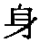 【提示】中间的两横,宋体与左右两边相接,楷体与左边相接,与右边相离。 *身shēn7画 身部 (1) 人或动物的躯干部分: ~首异处。 (2) 人或动物的整个躯体: ~材|转~|全~|半~。 (3) 物体的主干部分: 车~|船~|机~|河~。 (4) 自我;本人: 以~作则|~临其境|~体力行。 (5) 自己的身份、品德、才智等:出~|修~|立~|吾日三省(xǐng)吾~。 (6) 量词。指全身的衣服: 做了一~新衣服。 身 ☚ 身部 部">  部 ☛ 身shēn甲骨文作 ,象人大肚子形,或肚子中有子字,或简化成一点,金文同,篆隶演变成一 。怀孕状。 是娠(shēn,从女、辰声)和孕的本字。常有些象形字,逐渐演变得不象形,改为形声字,如它蛇、北背、|棍例。金文腹下又多一横,小篆变为一折笔。隶楷变一撇。对小篆的腹内一横变为两横。现代指怀孕还有说“有了身子”的。引申指人或动物的躯体。如:全身|上身|人身自由。组词如:身体|身躯。引申指物体的主要部分。如:船身|河身。引申指生命。如:以身殉职。又指亲身,亲自,本人。如:身临其境|以身作则。组词如:亲身。又引申指人的地位。如:身败名裂。组词如:身份。又作衣服的量词。如:一身儿新衣服。 身★常◎常
