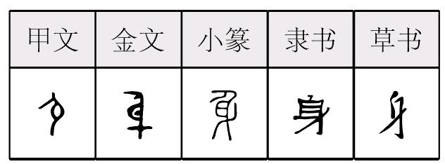 ❹ 镫里藏身|独善其身|断发文身|反求诸身|粉骨糜身|粉骨碎身|奋不顾身|忿不顾身|剪发文身|碌碌终身|明哲保身|被发文身|披发文身|惹火焚身|惹火烧身|三省吾身|铁胆包身|验明正身|艺不压身|引火烧身|著述等身|著作等身 身身,甲骨文作 ,金文作  ,小篆作 。 甲骨文象人而突出其腹部,也可以理解爲在 “人” 的腹部位置加圓圈作指事符號,可能是 “腹” 和 “身”共同的表意初文。金文第三字形加注 “吕”(宫)聲,又用作 “躬”。“身” 的本義是指身體的腹部,引申爲身軀、身體、生命、身孕、畢生、親自、體驗、擔任、身份等義。卜辭多用本義。銘文或用自身、親身等義。 楚簡帛文作 ,猶用古體。秦簡牘文作  ,古意猶存,古隸典型。 身(shēn)“ ,躳也。象人之身。从人, 声。凡身之属皆从身。”(失人切) 甲骨文或作 ,金文或作 、 、 、 ,象人身形。或说从人之腹部隆起,象有孕之形,有妊娠义,如:“丙申卜, ,贞:妇好身,弗以妇葬。”(《乙》6691)卜辞中也指人的腹部,如:“贞:勿于父乙告疒身。”(《乙》5839)[1]《诗·大雅·大明》:“大任有身,生此文王。”毛传:“身,重也。”郑玄笺:“重,谓怀孕也。”孔颖达疏:“以身中复有一身,故言重。”许慎这里解释为“躳”,意思是“身躯”。《楚辞·九歌·国殇》:“身既死兮神以灵,魂魄毅兮为鬼雄。”金文中“身”承袭甲骨文,或于腹部加一点,或于下部加一横为饰,可以表示人体。如毛公鼎:“ (以)乃族干吾( 敔)王身。”[2]战国文字包山楚简作 、 、 ,郭店楚简作 。睡虎地秦简作 、 。 身部只有一个属字“躯”,云:“体也。从身,区声。” 身shēn(7画)