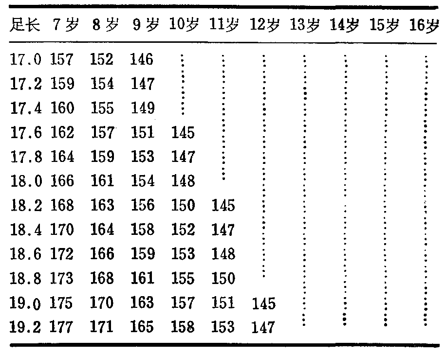 续表 足长(cm) | 7 岁 | 8 岁 | 9 岁 | 10 岁 | 11 岁 | 12 岁 | 13 岁 | 14 岁 | 15 岁 | 23.8 24.0 24.2 24.4 24.6 24.8 25.0 25.2 25.4 25.6 25.8 26.0 26.2 26.4 26.6 26.8 27.0 27.2 27.4 | | | 193 195 | 185 187 189 190 192 193 195 | 179 181 182 184 185 187 188 190 191 193 194 196 | 173 174 176 177 179 180 182 183 184 186 187 189 190 192 193 195 | 170 171 173 174 175 177 178 180 181 183 184 185 187 188 190 191 193 194 195 | 168 170 171 172 174 175 177 178 180 181 182 184 185 187 188 189 191 192 194 | 167 168 170 171 172 174 175 177 178 179 181 182 184 185 186 188 189 191 192 |