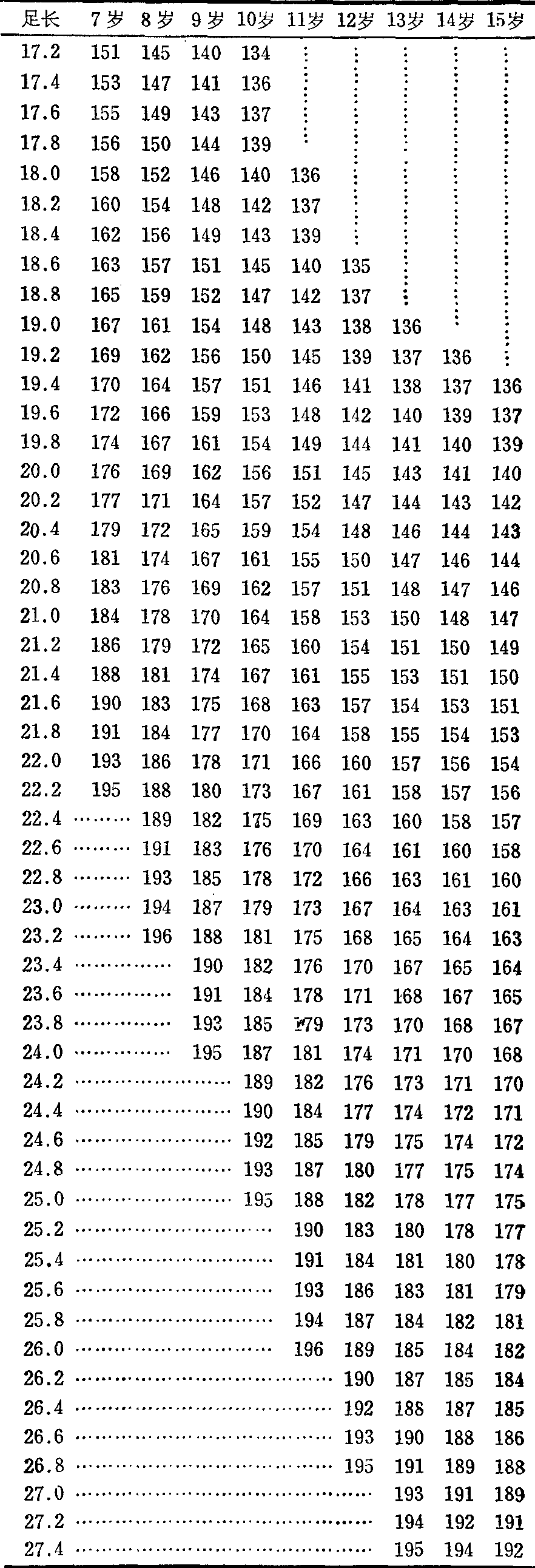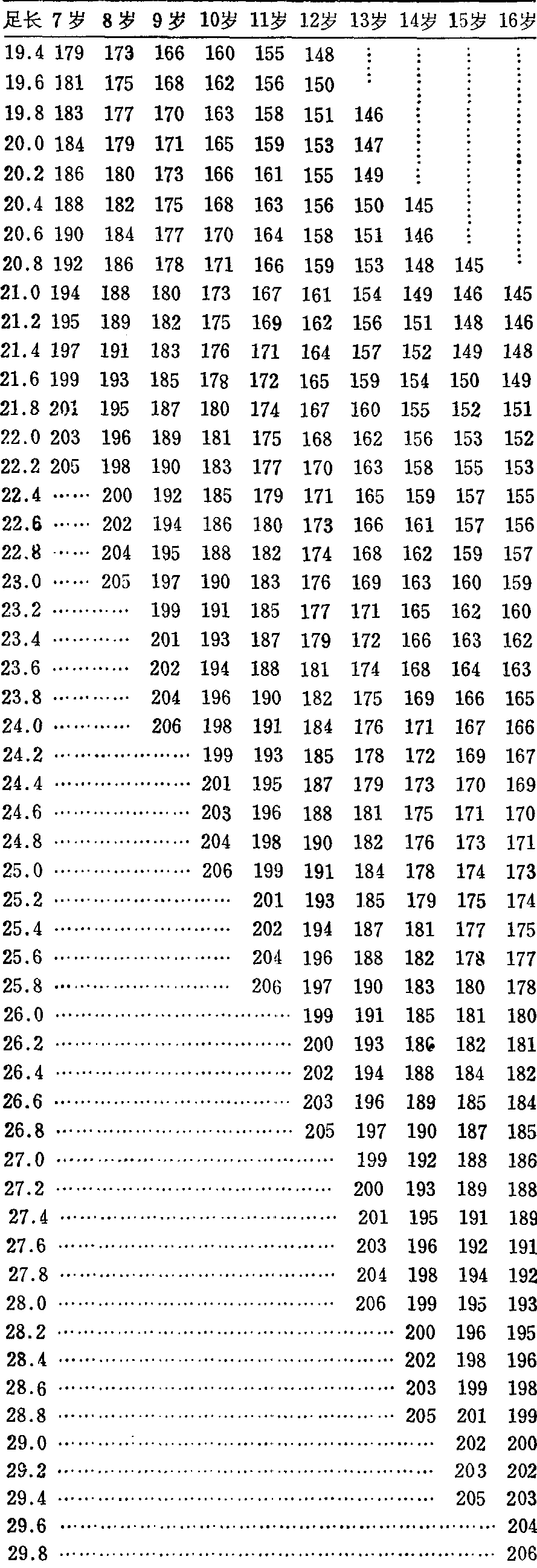续表 足长(cm) | 7 岁 | 8 岁 | 9 岁 | 10 岁 | 11 岁 | 12 岁 | 13 岁 | 14 岁 | 15 岁 | 16 岁 | 23.6 23.8 24.0 | | | 202 204 206 | 194 196 198 | 188 190 191 | 181 182 184 | 174 175 176 | 168 169 171 | 164 166 167 | 163 165 166 | 24.2 24.4 24.6 24.8 25.0 | | | | 199 201 203 204 206 | 193 195 196 198 199 | 185 187 188 190 191 | 178 179 181 182 184 | 172 173 175 176 178 | 169 170 171 173 174 | 167 169 170 171 173 | 25.2 25.4 25.6 25.8 | | | | | 201 202 204 206 | 193 194 196 197 | 185 187 188 190 | 179 181 182 183 | 175 177 178 180 | 174 175 177 178 | 26.0 26.2 26.4 26.6 26.8 | | | | | | 199 200 202 203 205 | 191 193 194 196 197 | 185 186 188 189 190 | 181 182 184 185 187 | 180 181 182 184 185 | 27.0 27.2 27.4 27.6 27.8 28.0 | | | | | | | 199 200 201 203 204 206 | 192 193 195 196 198 199 | 188 189 191 192 194 195 | 186 188 189 191 192 193 | 28.2 28.4 28.6 28.8 | | | | | | | | 200 202 203 205 | 196 198 199 201 | 195 196 198 199 | 29.0 29.2 29.4 | | | | | | | | | 202 203 205 | 200 202 203 | 29.6 29.8 | | | | | | | | | | 204 206 |
