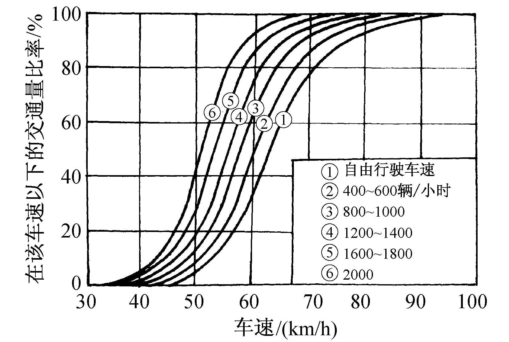 用以观测和分析车速高低与交通量大小的关系及研究交通流理论和通行能力曲线。观测车速,路段上交通量增多,平均车速则降低,车速分布必然变化的规律。车头时距愈小,车速愈接近相等,即标准离差逐渐变小。车速分布与交通量、车辆数频率的变化可形象地表现在图(a)中。图(b)是实测某高速公路外侧车道几处平坦直线路段的地点车速,综合地表示车速分布的累积曲线与交通量的关系。它表明随着交通量增大到2000辆/小时,85%位车速与15%位车速相差范围大致从20km减少到12km。交通量大的路段后续车辆不得不按低速跟随前车;