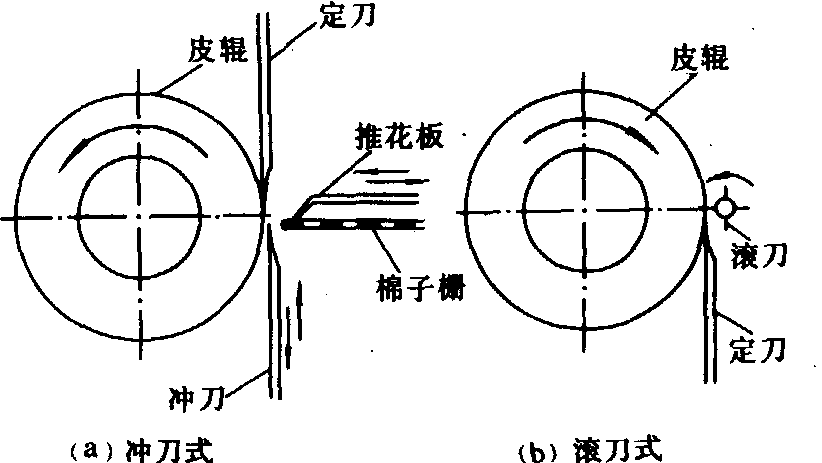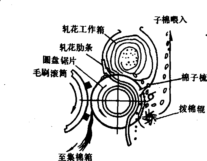 释义 | 碾压 碾压轧(~花;~平;~钢;~制;滚~) ☚ 压 撞击 ☛ 轧花cotton ginning用机械从子棉上分离纤维(皮棉)的过程。为了保证轧花的质量,对不同纤维长度、品级及含杂不同的棉花宜选用不同的轧花机械。送轧子棉的含水率需掌握在10%以下,最适宜的含水率为6%~8%。使用的轧花机,有皮辊机和锯齿机两种: ❶皮辊轧花机,主要用于轧长绒棉(海岛棉系)和细绒棉。由皮辊、定刀、动刀(冲刀)、推花板及棉子栅等部件组成(图1),利用棉纤维可以粘附在摩擦系数较大的运动物体表面上的特性,分离纤维。工作时棉花由往复运动的推花板推向皮辊,棉纤维粘附在皮辊表面并被拖动随之转动。带纤维的棉子被定刀阻挡于定刀口,上下往复运动的冲刀或转动的滚刀冲击棉子,使其与纤维分离,从棉子栅落下,皮棉则随皮辊转到另一侧被脱下,如此循环进行轧花。皮辊轧花机体积小,结构简单,造价低,但生产率低,能源消耗较多。 图1 皮辊轧花机工作原理示意 图2 锯齿轧花机工作原理示意 为了提高锯齿轧花机的生产率,减少子棉卷运动阻力,增加子棉卷表面运动速度,在工作箱上增加内排子管及排棉辊等工作部件,有帮助子棉卷转动的作用,同时辊子可减少摩擦阻力,使每一锯片的小时生产率由5千克左右提高到10千克以上。 轧出的皮棉在品级、长度、含杂率、疵点,黄根率、不孕子率、衣分亏损率及棉子毛头率等方面都有规定与要求。轧花后的棉子可进一步加工利用。 |