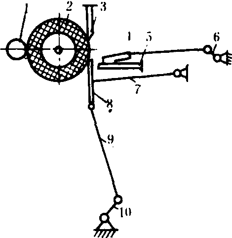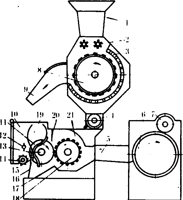 释义 | 轧花机cotton gin将籽棉分离成皮棉和棉籽的机器。每根棉纤维在籽棉上的连结力一般是纤维抗拉力的40~60%,所以正常的轧花作业不会损伤或轧断棉纤维。轧花机按工作原理分为皮辊轧花机和锯齿轧花机。 图1 冲刀式皮辊轧花机工作原理图 1.拨棉辊; 2.皮辊;3.定刀;4.推花板;5.棉籽栅;6.推花板曲轴;7.撑杆;8.动刀;9.连杆;10.动刀曲轴 皮辊轧花机有多种型式。常用的是冲刀式皮辊轧花机,其结构及工作原理如图1所示。当籽棉被喂入推花板前端的棉籽栅上时,推花板作前后往复运动,将籽棉推向定刀和动刀之间的皮辊表面,定刀对皮辊有适当压力,动刀依靠曲轴的转动作上下往复运动,配合推花板冲击籽棉,旋转的皮辊表面粗涩而富有弹性,将籽棉上的长纤维牵引至定刀口内,附在皮辊表面转出,落入集棉箱,棉籽被阻隔在定刀口,经棉籽栅落下。由于皮辊轧花机是依靠皮辊转动拉取棉纤维,作用力比较缓和,不易拉断棉纤维,而且棉结、索丝少,轧花质量好,所以适合加工长绒棉,但工作效率低,轧出的皮棉色泽较差。 皮辊轧花机皮辊一般为钢轴外包木材作衬,外层主要用旧轮胎或胶布条,也可用脱脂牛皮或牛皮夹橡胶带裹紧。所轧皮棉等级与皮辊材料摩擦系数大小有关。常用的皮辊轧花机的皮辊长度有400、600、700、800、900毫米等规格,前2种一般用作收购棉花时的衣分试轧,后3种用以加工长绒棉和低级棉。有些国家还有较大型的皮辊轧花机(皮辊长1016~1232毫米)、滚刀式皮辊轧花机和双皮辊双冲刀轧花机,用以提高生产率。滚刀式皮辊轧花机主要是用滚刀代替冲刀式皮辊轧花机的动刀,使产量大幅度提高,主要用于加工纤维长度为32毫米以上的棉花。 锯齿轧花机 常用的有毛刷式和气流式两种类型。锯齿轧花机的主要部件是锯片辊筒,由若干锯片和隔圈间隔安装在轴上,两端装有压环,用螺母固定。锯齿辊筒转速为700~850转/分。一般锯片直径为320毫米,厚度1毫米,齿数为304齿,齿形角20°。锯齿轧花机的生产率常以每个锯片每小时皮棉产量——片时产量表示。 毛刷式锯齿轧花机 由清花、轧花、集棉3个主要部分组成(图2)。送入盛花斗的籽棉.由喂花辊均匀地喂入,受到清花刺辊的冲击而松解,部分杂质通过排杂网由排杂螺旋排出,完成清花作业; 抖松的籽棉沿淌花板进入前厢,再由拨花翼辊送至伸出阻壳肋条的锯片钩取,随锯片旋转而带人中厢,形成转动的籽棉卷; 锯片从轧花肋条排的间隙中将籽棉卷中的纤维钩出并送入后厢,由于相邻肋条间隙(2.7~3.0毫米)小于棉籽的短径,只能让锯片和棉纤维通过,而棉籽被肋条阻留在中厢内,使其与棉纤维分离,完成轧花过程。锯片上钩取的棉纤维被反向高速旋转的毛刷辊筒刷下,经皮棉管道送往集棉尘笼或直接由皮棉管道送往打包机打包;或进入皮棉清理机。纤维中残留的不孕籽、破籽壳等杂质,一部分通过轧花机肋条抛向前挡风板,从锯片间落下;一部分被毛刷辊筒刷下后,在排杂调节板前与纤维分离,抛出机外。 图2 毛刷式锯齿轧花机 1.盛花斗; 2.喂花辊; 3.排杂网; 4.排杂螺旋; 5.皮棉道; 6.集棉尘笼; 7.压棉辊; 8.清花刺辊; 9.出花口; 10.前厢; 11.锯片辊筒; 12.拨花翼辊; 13.轧花肋条排; 14.拨花刺辊; 15.阻壳肋条排; 16.淌籽板;17.排杂调节板; 18.毛刷辊筒; 19.中厢; 20.前挡风板; 21.后厢 气流式锯齿轧花机 与毛刷式锯齿轧花机的区别仅在其刷棉部分。当被锯片钩取的棉花纤维通过轧花肋条间隙,旋转到风嘴时,由储气箱经风道吹来的高速气流(风压4~5千帕)将纤维吹下,从受棉口经皮棉管道送往皮棉清理机或打包机。纤维中的杂质分别由吸不孕籽风嘴和下排杂刀处排出。 锯齿轧花机主要优点是生产率高、能耗低、占地面积小,一般1台80片锯齿轧花机产量相当于10台700毫米皮辊轧花机的产量。加工同等级籽棉,色泽好,皮棉含杂少,短绒率低,棉纤维整齐度高。但在轧制长绒棉时,不易保证纤维长度。为此,20世纪80年代末,已开始研制片时产量高(超过10千克)、全封闭防尘(机器周围空气中含尘量不超过10毫克/米3)、能耗少(每百千克皮棉耗电量不大于3.5千瓦小时)的锯齿轧花机。尤其注重提高机器本身性能、改进工作厢结构、合理配套辅助设备等方面的研制,从整体上提高轧花效率和轧花质量。 |
