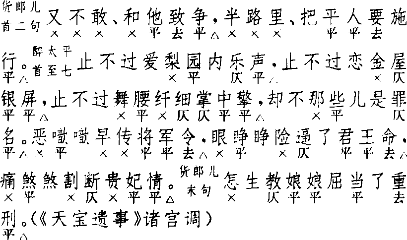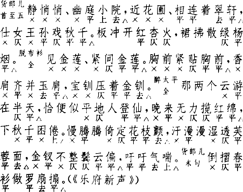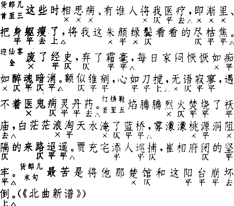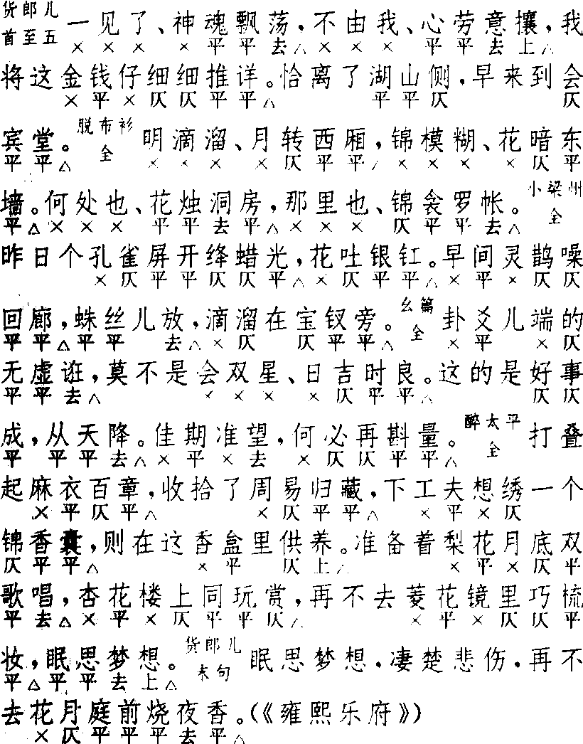 释义 | 转调货郎儿 转调货郎儿王伯成 《玄宗幸蜀》套 ![]() 〔转调货郎儿〕为北曲集曲,《北词广正谱》始用此名,收金仁杰《追韩信》佚曲、刘时中《上高监司》第一套、岳伯川《梦断杨贵妃》残套中曲共三曲。各曲原标牌名多误,《广正》始为考定。《北曲新谱》广列元明作品,共收十曲。今增补至十三曲,分为四体,每体略加说明。详参《新谱》。此为第一体,首为〔货郎儿〕前数句,中集〔醉太平〕或全或不全,末为〔货郎儿〕末句,末句前或有增句。他如朱有燉《悟真如》:〔货郎儿〕首至五、〔醉太平〕首至七、〔货郎儿〕末句;丘汝成《上太师》套:〔货郎儿〕首至五、〔醉太平〕首至七、〔货郎儿〕末句,末句前增四字二句;范居中〔金殿喜重重〕南北合套、无名氏“新绿池边”散套:〔货郎儿〕首至五、〔醉太平〕首至七、〔货郎儿〕末句,末句前增七字一句;金仁杰《追韩信》佚曲:〔货郎儿〕首至三、〔醉太平〕首至七、〔货郎儿〕末句,末句前增三字二句;刘时中《上高监司》第一套:〔货郎儿〕首至三、〔醉太平〕全、〔货郎儿〕末句。共七曲。 其二 无名氏 小令 ![]() 此为第二体,较第一体〔醉太平〕前增〔脱布衫〕全曲。他如无名氏《杀狗劝夫》:〔货郎儿〕首至五。第二句后有增句(句式同第二句)、〔脱布衫〕全、〔醉太平〕首至七、〔货郎儿〕末句;李文蔚《圯桥进履》、岳伯川《梦断杨贵妃》残套:〔货郎儿〕首至五、〔脱布衫〕全、〔醉太平〕首至七、〔货郎儿〕末句,末句前增七字一句。共四曲。〔转调货郎儿〕独用作小令者,仅此无名氏一例。 其三 刘庭信 《金钱问卜》套 ![]() 此为第三体,较第二体〔脱布衫〕后增〔小梁州〕及〔幺篇〕。此曲《盛世新声》、《词林摘艳》本皆无〔小梁州〕、〔幺篇〕及〔醉太平〕末句,则同第二体。 其四 汤舜民 《题情》套 ![]() 此为第四体。中集〔中吕·迎仙客〕及〔红绣鞋〕首至五,因二曲亦入〔正宫〕也。原标牌名多误,此据《北曲新谱》移录。 ☚ 货郎儿 九转货郎儿 ☛ |