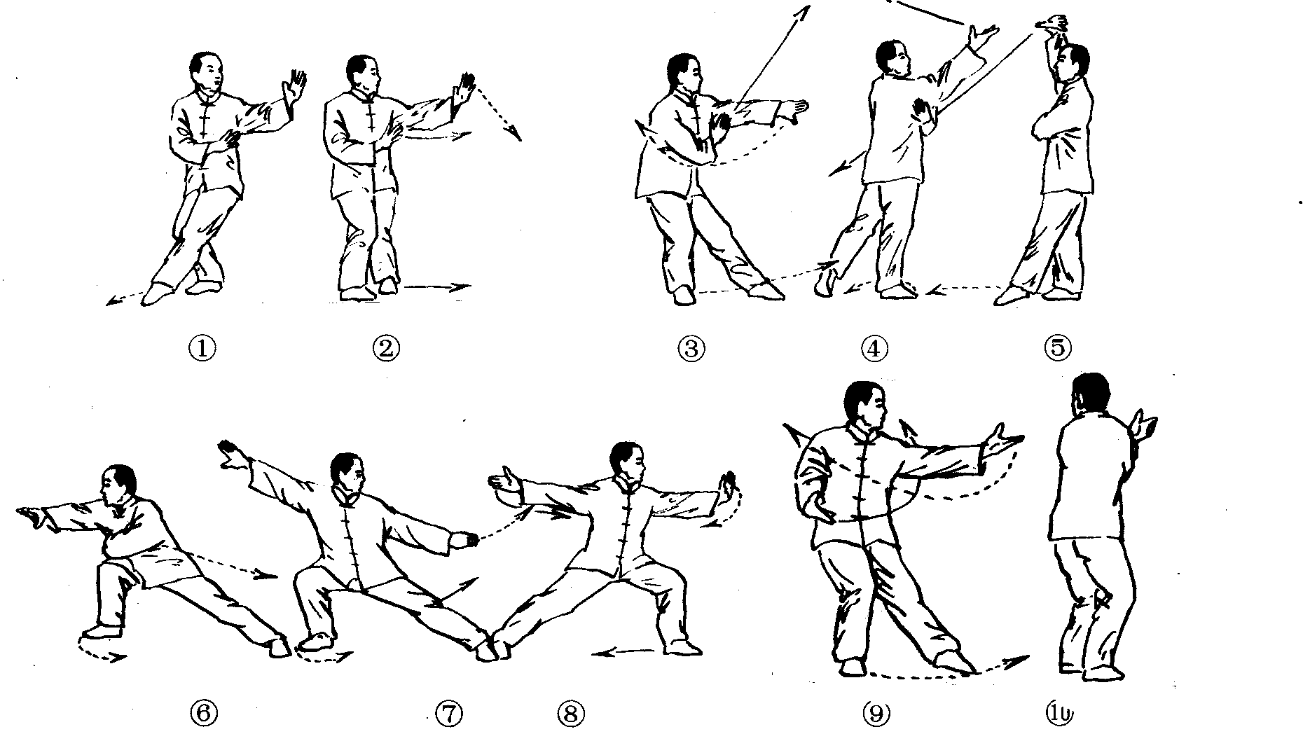 ❾青龙探爪:出右脚成右势青龙探爪。动作要领:猛虎回头的转身要灵活,右掌扑按和迈步要同时完成。注意事项:老年初学者应特别注意做猛虎回头时要在上步的同时以身带掌扑按。