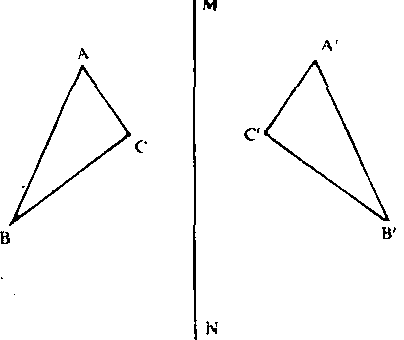 ❷两个图形是以一条直线为对称轴的轴对称图形,如左图,△ABC和△A' B' C'就是以直线MN为对称轴的对称图形。不论是哪一种轴对称图形,对称轴总是一条直线,而不是一条线段。