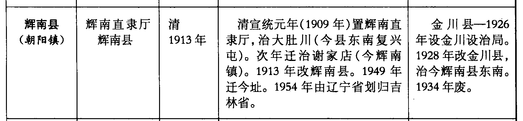 辉南县(朝阳镇)辉南直隶厅辉南县清1913年清宣统元年(1909年)置辉南直隶厅,治大肚川(今县东南复兴屯)。次年迁治谢家店(今辉南镇)。1913年改辉南县。1949年迁今址。1954年由辽宁省划归吉林省。金川县—1926年设金川设治局。1928年改金川县,治今辉南县东南。1934年废。