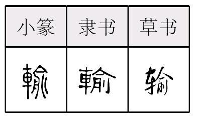 shū輸,形声,从車,俞声,本义为运送、传送,引申为捐献、缴纳,假借为失败。《简化字表》类推简作“输”。 |