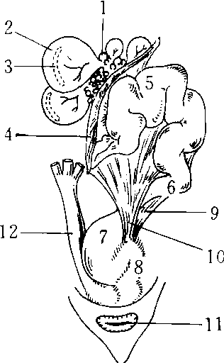 释义 | 输卵管shū luǎn guǎn女子或雌性动物生殖器官的一部分。1903年汪荣宝等《新尔雅·释生理》:“具卵巢、输卵管、子宫、膣、阴核及阴唇六者,为女子生殖器。”◇子管、喇叭管、卵[XCHAR[R201405004_FZSYK_F8A2]]。 输精管←→输卵管shū jīng guǎn ← → shū luǎn guǎn输精管:男子或雄性动物生殖器官的一部分。是将精子从睾丸输送到精囊里去的管道。 输卵管 输卵管输卵管为一对弯曲的长管,位于子宫阔韧带的上缘内,长约7—15厘米,其内侧端开口于子宫腔,为输卵管子宫口;外侧端游离,在卵巢附近开口于腹膜腔,称输卵管腹腔口。输卵管的管径由子宫至卵巢逐渐变粗,全长由内侧向外侧可分四部分:在子宫壁内的一段称子宫部或间质部;内侧1/3部管腔径较细,称输卵管峡;而外侧2/3部管径较粗,称输卵管壶腹;输卵管的卵巢端扩大,呈漏斗状,称输卵管漏斗或伞部,其游离缘有多数锯齿状突起,叫输卵管伞。输卵管的管壁有三层组织,最外层的浆膜层,中间的肌层及最内层的粘膜层。平时肌纤维收缩产生输卵管的蠕动,以协助卵子向宫腔移动;其粘膜的上皮细胞有纤毛,纤毛向子宫方向的摆动可帮助运送卵子。输卵管的生理作用是吸取卵巢排出的卵子。精子和卵子在输卵管内结合受精。输卵管输送卵子或受精卵进入子宫腔里。在临床上通常将输卵管和卵巢合称为子宫附件。 ☚ 卵巢 乳房 ☛ 输卵管 输卵管输卵管位于子宫两侧,是输送卵子到子宫去的管道,分漏斗部、壶腹部、峡部和子宫部。管壁由粘膜、肌层和浆膜三层组成。粘膜有许多纵行而分支的皱襞,壶腹部的皱襞最发达,高大而分支多,故管腔极不规则。至子宫部,皱襞渐趋减少。输卵管大部分粘膜上皮为单层柱状,含有纤毛细胞和分泌细胞。纤毛细胞以漏斗部和壶腹部最多,越近子宫部越少,纤毛向子宫方向摆动,有助于卵子向子宫移动。分泌细胞的分泌物构成输卵管液,有助于卵子向子宫移动和阻止外来的病菌进入腹腔。输卵管上皮细胞在卵巢雌激素和孕酮的影响下,也随月经周期而有变化。肌层为平滑肌,峡部最厚,分内环行平滑肌和外纵行平滑肌两层,但无明显分界。排卵时,输卵管伞的粘膜充血胀大,由于伞部肌肉的收缩,因而漏斗的开口与卵巢表面接近输卵管粘膜上皮的纤毛朝着子宫方向摆动,纤毛运动和肌层收缩作用将卵子向子宫推送。输卵管的主要功能是运送卵细胞和提供受精场所,它对精子的获能、受精卵的正常卵裂和生存都是很重要的。 ☚ 卵巢内分泌 月经 ☛ 输卵管 输卵管输卵管也是女性内生殖器的一部分。它是一对细长而弯曲的管子。其内侧与子宫角相通连,外端游离而与卵巢接近。全长约8—14厘米。输卵管为卵子与精子相遇的场所,受精后孕卵由输卵管向子宫腔运行。输卵管壁由三层构成:外层为浆膜层,为腹膜的一部分,中层为平滑肌层,当平滑肌收缩时,能引起输卵管由远端向近端蠕动。内层为粘膜层,有些上皮有纤毛可以摆动。平滑肌蠕动及纤毛摆动有助受精卵向宫腔运行。卵管上皮受性激素影响,也有周期性组织学变化,但不如子宫内膜明显。 ☚ 卵巢 骨盆 ☛ 输卵管uterine tubes动物体内输送卵子和早期胚胎的生殖管道。位于卵巢和子宫角之间,左右各一,管腔小而弯曲,其前端膨大为输卵管漏斗,中央开口称输卵管腹腔口,与腹膜腔相通。另一端有输卵管子宫口通子宫角。输卵管不仅能接纳、运输卵子,而且前 母鸡生殖器官 1.卵巢 2. 成熟卵泡 3. 卵泡斑 4. 漏斗 5. 膨大部 6. 峡 7. 子宫 8. 阴道 9.输卵管背侧韧带 10. 腹侧韧带 11. 肛门 输卵管oviduct系输送卵子的管道。输卵管左、右各一条,呈弯长的喇叭形管,在子宫阔韧带内,悬挂于骨盆侧壁与子宫侧缘间,长约7~15cm,外端开口于腹腔,称为输卵管腹腔口;内端开口于子宫腔,叫输卵管子宫口。输卵管由外向内可分4部:输卵管漏斗、输卵管壶腹、输卵管峡及子宫部。右侧输卵管、阑尾及右侧输尿管第二狭窄处均接近,故这些器官的疾病症状相似易发生混淆,诊断常发生困难,需注意鉴别。 输卵管一对细长而弯曲、形状如喇叭的管道,内侧起自子宫两角,外端游离与卵巢接近,为精子与卵子相遇的场所,并将孕卵输送入子宫腔,若受精卵停留在此生长,则形成输卵管妊娠。女性绝育常采用输卵管结扎术。 输卵管 输卵管人和动物体内输送卵细胞的生殖管道。人的输卵管位于盆腔内,左右各一,内端与子宫角相连通,外端游离,呈漏斗状,开口于腹腔,接受来自卵巢排出的卵细胞。卵子一般在输卵管内受精。管壁有平滑肌,管腔内面的粘膜有纤毛。平滑肌收缩和纤毛运动均可使卵细胞向子宫方向移动。 ☚ 卵巢 子宫 ☛ 输卵管uterine tubes为女性生殖器官,是一对弯曲的肌性管道。长8~12cm,位于子宫两侧,子宫阔韧带上缘内。内端开口于子宫腔,称子宫口;外端游离,以腹腔口开口于腹膜腔,由内向外可将输卵管分为子宫部、峡部、壶腹部和漏头部。漏斗部游离缘有许多指状突起,构成输卵管伞,是识别输卵管的重要标志。峡部最细,是结扎术的常用部位。通常将输卵管与卵巢合称为子宫附件。 输卵管 输卵管输卵管是一对输送卵细胞和进行受精过程的肌性管,长约10cm位于子宫阔韧带上缘内。输卵管从游离的外端转向内侧,分为输卵管漏斗、输卵管壶腹、输卵管峡和子宫部(子宫壁间部)(见“卵巢”条图),输卵管漏斗为该管末端扩大部,有小于1mm的输卵管腹腔口,该口开