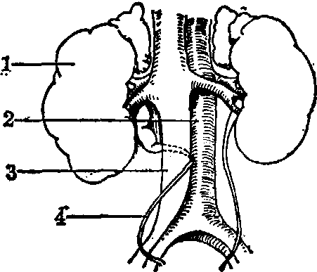 下腔静脉后输尿管(图) 右侧输尿管于第三、四腰椎平面,从下腔静脉后经主动脉和下腔静脉间绕向前,再回到外侧的正常途径进入膀胱,系因下腔静脉发育异常所造成。于胚胎期,后肾从骨盆上升至腰部,穿过由静脉干和分支构成的静脉环,如位于静脉环前面的右侧后主静脉不萎缩,静脉血持续循此静脉回流,使其形成下腔静脉,输尿管即异位于下腔静脉后面。
