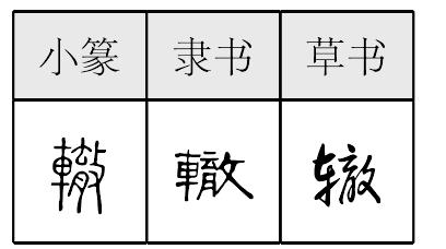 【提示】车,末笔是竖; 单独位于字左时,横改提,且末笔是提。 育, 下面是⺝,起笔是竖,不是撇。月,单独位于字或部件的下面时,起笔的竖撇改成竖;月中间的两横,宋体与左右两边相接,楷体与左边相接,与右边相离。攵,4画,不要错写成3画的夂。 *辙(轍)zhé16画 车部 (1) 车轮压出的痕迹: 车~|覆~|如出一~。 (2) 行车规定的路线方向: 改~|上下~|南辕北~。 (3) 杂曲、戏曲、歌词所押的韵: 合~|十三~。 (4) 〈方〉办法;主意: 没~|想~。 辙轍zhé甲金文和小篆及古书作彻(徹)。甲骨文和西周金文象手拿鬲(lì,鼎类食器)形,撤掉,撤退义。战国先从攴(扑本字)从鬲,后又彳(走路义)。小篆隶楷鬲字讹成育字。作徹。现规范作彻(成形声字)。彻(徹)引申有通达,遵循义。后引申指车迹。如:善行无彻迹(见《老子》)|(车)彻广六尺(见《周礼》)。约六朝时造辙字。从车,徹省声。分化字。约明代前后、声母不送气,读zhé,本浊声母在仄声(上、去、入)韵母前不送气。车辙,指车轮碾出的痕迹。辙指车行的一定路线。如:顺辙儿。引申指歌词、戏曲所押的韵。如:合辙|十三辙(指北京音、京剧音等)。现方言中又指办法。如:没辙了。 辙轍★繁◎常★常