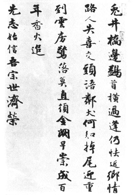 【赏析】: 使小字写出大字的气象,如绘画咫尺要有万里之势一样是十分困难的。蒋灿此作正是篇幅不大而气象岿然。其书法度严谨,有“二王”遗风,但又隐含北魏素质。用笔力强气厚,势态排宕,墨色浓润。字取横势,稳重而矫健多姿,大小、疏密、收放等结构中诸种艺术因素对立统一,与线条的轻重、肥瘦、疾涩的生动变化交相辉映,融滙爲一,构成节奏鲜明、雅练瑰丽的整体效果,灿然盈楮。而作者自己的心緖、修养也就寄寓在这节奏动人的线的运动及空间构造之中,作品意味十分隽永。 |