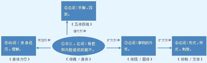 字源解说 豊,既是声旁也是形旁,表示装在器皿中祭祀的珍品。體,金文 = (身)+ (豊,盛器中的珍品),比喻分布在身子里的诸多重要器官。篆文 用“骨” 代替金文的“身” ,强调“骨骼”对“身子”的支撑作用,以及“骨腔”对“脏器”的保护作用。隶书 用“肉” 代替篆文的“骨” ,强调“体”的“肉质”特征。造字本义:骨腔和诸多内脏组成的躯干。俗体楷书则另造会义字, = (人,身子)+ (本,主干),表示“人之本”,即躯干。 附 文言版《説文解字》:體,緫十二屬也。从骨,豊聲。 附 白话版《说文解字》:体,总括人身十二(所有)部分。字形采用“骨”作边旁,采用“豊”作声旁。 引申线索