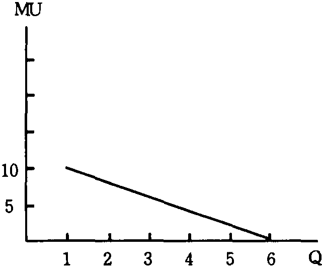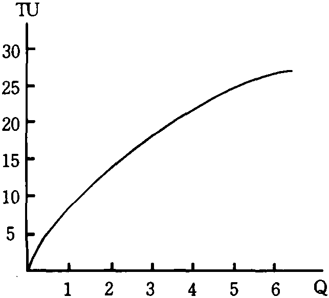 在表中,某一商品的消费量从0增加到1时,消费者感到获得的满足或效用为10个单位。这时总效用从0增加到10,总效用增量即边际效用为10。当消费量从1增加到2时,总效用从10增加到18,总效用增量即边际效用为8。以此类推。消费量达到5时,消费者的消费量达到饱和点。此后总效用不再增加,边际效用为0。这时,消费者被认为已经达到饱和点。在微观经济学中只研究消费者到达饱和点之前的情况。根据效用表中的消费量、总效用和边际效用的数字,可以绘出消费者的总效用曲线 (图1) 和边际效用曲线 (图2)。在图1中,纵轴Tu表示总效用,横轴Q表示消费量。总效用Tu随消费量增加而以递减的速度增加,达到消费饱和时,总效用不再增加,曲线为水平状。图2中纵轴Mu表示边际效用,横轴Q表示消费量。边际效用曲线随消费量的增加而递减。效用表和效用曲线都表示了边际效用递减的趋势。这一趋势就是所谓边际效用递减规律。边际效用递减规律指的是,消费者在一定时间内消费某一商品时,随着消费量的增加,该商品的边际效用或总效用增量趋于递减。基数效用论者断言,边际效用递减规律可以为内省法或心理实验所证实。从效用表和效用曲线可以看到边际效用和总效用之间存在着这样的关系: 边际效用为正时,总效用增加,边际效用为0时,总效用最大。西方经济学家除了运用边际效用概念分析消费者行为之外,还用这一概念解释商品价值的决定问题,认为商品的价值是由该商品对人们的边际效用决定的,边际效用大则商品的价值量大,边际效用小则商品的价值量小。这就是西方经济学中关于边际效用价值论的简要解释。