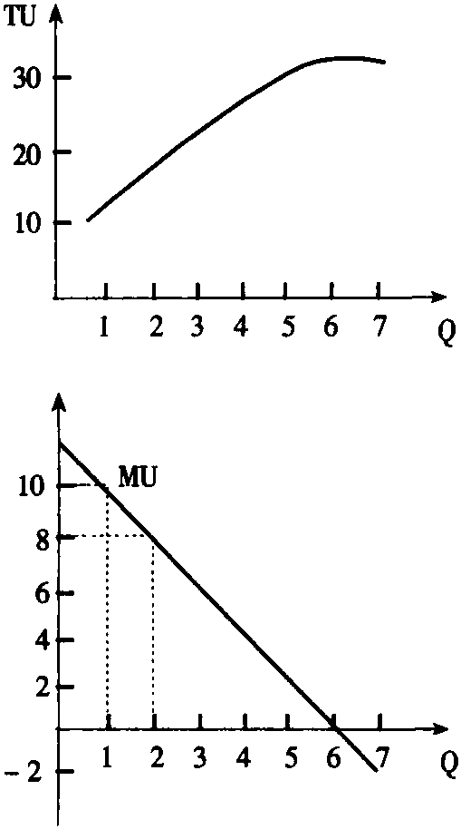 商品数量 | 总效用 | 边际效用 | 1 | 10 | 10 | 2 | 18 | 8 | 3 | 23 | 5 | 4 | 27 | 4 | 5 | 29 | 2 | 6 | 30 | 0 | 7 | 28 | -2 |