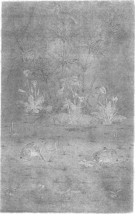 辽。无款。绢本设色,纵114.3厘米,横56厘米。辽宁省博物馆藏。1974年发现于辽宁省法库县叶茂台七号辽墓。与《深山棋会图》分别挂在木棺室内东西两壁。此图旷野中,纤草遍地,蒲公英、白头翁、地黄花叶招展。三竿细竹挺立其后,修长、摇曳的竹枝上各栖一只麻雀,一只在梳理羽毛,另一只侧头俯看花蕊深处,似乎是在寻找躲在里面的小虫。两只褐色的野兔蹲踞竹下,一只抬头张望,一只专心吃草,表现出一种天然的野逸之趣。画面采用对称构图,竹、草、雀、兔都有意安排成左、右对称的形式,而同时又在平衡之中寓有变化,不致使人产生呆板、平滞之感。笔墨技巧也颇具特色,双钩作竹,着色极淡。兔毛鸟羽刻画极为工细,而野花则线条疏阔,以青绿重彩描绘,整个画面有较强的装饰效果。