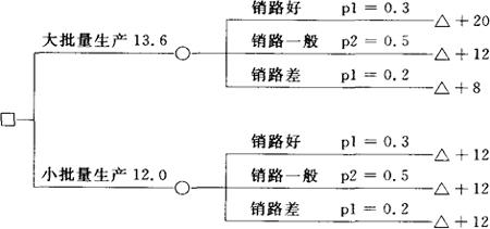 描述决策过程的树状操作程序图。 用于处理多阶段和多种可能的问题决策方法。具体做法是将各种可能的决策方案按阶段及其相互联系,用树形图表示出来。任何可能的有关情况和概率都出现在相应的分支上,然后运用概率的方法求出方案的损益值,最后按决策原则和程序进行优化。其中有三种结点:(1)□表示决策结点。 从它引出的分支称为方案分支,分支数反映可能的行动方案数。(2)〇表示方案结点。 它上面的数字表示该方案的效益期望值,从它引出的分支称为概率分支,分支数反映了可能出现的事件数,每条分支上面标明了这一事件出现的概率。(3)△表示结果结点。 亦称末梢。它旁边的数字是每一方案在相应事件状态下的效益值。 在决策时,首先应按问题的性质绘制决策树;然后根据事件出现的概率和效益值,计算出各事件的效益期望值;最后就可以根据各方案结点的效益期望值大小作出决策。在图中所示,大批量生产的效益期望值为0.3×20+0.5×12+0.2×8=13.6,小批量生产的效益期望值为0.3×12+0.5×12+0.2×12=12.0。 因此,做出的决策是大批量生产。