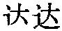 dá形声,小篆1从辵,羍(tà)声,隶定为“達”。本义为畅通,引申为到达、明白、显贵、表达等。小篆2、汉代俗字写作“达”,音符改为大。《简化字表》参照俗字简化。 【辨析】 ❶以“达”作音符构成的形声字一般韵母为ɑ,但声调和声母不同。dá:鞑∣dā:哒∣tà:挞、闼。 ❷“达(達)”可作类推简化偏旁使用,如:挞(撻)、哒(噠)、闼(闥)。 ❸达/通 见411页“通”。达〈名〉(1)爹。民国《济宁县志》:“大,父也。济宁称父曰大,亦有称达者,疑即爹之转音。” 《醒》四八: 狄希陈说:“你~替俺那奴才餂腚!” 《聊·慈》二: 乜孩子不够一揸,不为他娘也为他~,那棍子怎忍落的下? <异>大。答。 《金》三十: 教你拿酒,你醉的拿冷酒与你爹吃?原来你家没大了,说着你,还丁(钉)嘴铁舌儿的! 《醒》七: 快把恁答拿到吊远子去,可恶多着哩!(恁答,你爹,这里指八哥)<方>今山东、山西、江苏徐州、陕西关中、甘肃天水、安徽芜湖和浙江镇海、定海话有此义。 (2) 女人对所钟爱男子的昵称。 《金》七四: 妇人见他那话还直竖一条棍相似,便道:“~,你将就饶了我罢,我来不得了。”(万本) |