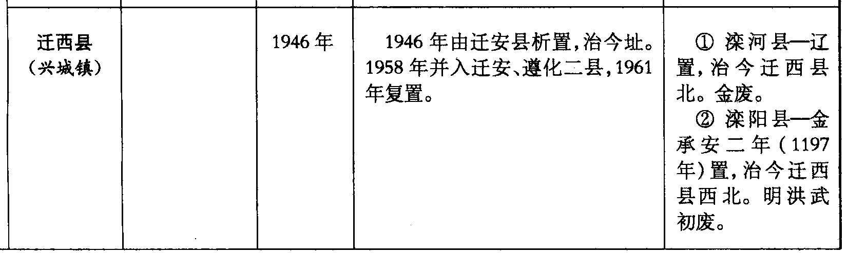 迁西县(兴城镇)1946年1946年由迁安县析置,治今址。1958年并入迁安、遵化二县,1961年复置。❶ 滦河县—辽置,治今迁西县北。金废。❷ 滦阳县—金承安二年(1197年)置,治今迁西县西北。明洪武初废。