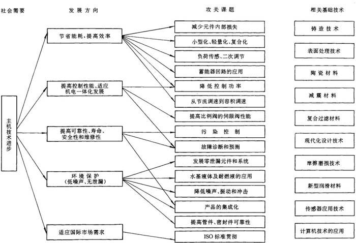 释义 | 冶金机械 主要向大型化、连续化、高速化和自动化方向发展。要提高产品性能,高效节能,用微电子技术改进传统产品,发展机电一体化产品,提高设备使用可靠性和易维修性,提高作业效率,改善操作性能和保护环境等,对液压系统和元件要求如下: ·高精度和高响应。提高电液位置控制系统精度和力控制系统精度,如轧机板厚(AGC),板宽和板型(CVC)液压伺服系统的精度和响应速度。 ·提高各类元件可靠性。电磁阀类元件要求寿命达到1000万次以上。 ·提高电液伺服阀和比例阀精度(减少滞环和提高直线性)、频响和可靠度。 ·机电一体化。发展内藏电子控制器的电液伺服驱动马达、伺服缸等电液伺服元件。 ·广泛采用集成化(插装阀、叠加阀)和复合化元件及系统,减少占地空间和防止外漏。 ·易维修性,实现液压系统故障诊断。 ·适应ISO14000环境保护标准要求,应用水压技术。 ·液压系统的污染控制 综合上述,为适应机械产品向高性能、高精度和自动化方向发展需要,液压产品主要发展方向是:节省能耗提高效率;提高控制性能以适应机电一体化的发展;提高可靠性、寿命、安全性和维修性;适应环境保护(降低噪声和振动、无泄漏)。 液压产品主要发展方向和具体技术开发课题见表49.3-3。 表49.3-3 液压产品发展方向和攻关课题 |