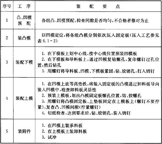 (一)模具零件的几种固定方法 1.紧固法 冲模的凸、凹模零件的紧固方法要点见表6.1-1。 表6.1-1 紧固法 (mm) 图6.1-1 无机黏结应用实例 2.无机黏结的配方 模具制造中常用的磷酸氧化铜黏结剂配方见表6.1-11 表6.1-11 磷酸氧化铜黏结剂配方 式 图6.1-4所示为小导套和凸模黏结固定实例。 (五)牙骨塑料在模具装配上的应用 牙骨塑料在模具制造中,主要用于浇注卸料板导孔,其浇注工艺见表6.1-17。它具有以下优点: 表6.1-17 牙骨塑料浇注工艺 1-下模板;2-凹模;3-定位板;4-卸料板;5-弹簧;6-上模板;7、18-固定板;9、11、19-销钉;10-凸模;12-模柄;13、17-螺钉;14-卸料螺钉;15-导套;16-导柱 2.复合模装配 复合模的装配要点见表6.1-23和表1.1-7图例。 表6.1-23 复合模装配要点 1-下模板;2-凹模;3-卸料板;4、13、17、19-螺钉;5-卸料螺钉;6-卸料弹簧;7-凸模固定板;8-垫板;9-侧刃;10-防转销;11-模柄;12、18-圆柱销;14、15-冲孔凸模;16-落料凸模;20-承料板;21-侧刃挡块;22、23-导料板 表6.1-24 级进模装配要点  |