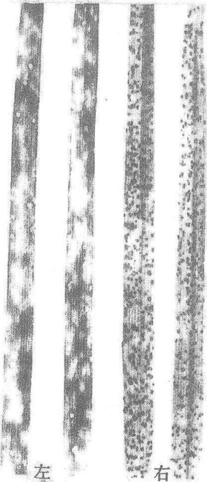 组织坏死与真菌被抑制的关系 通常认为细胞迅速坏死是过敏反应的重要特征,甚至认为没有坏死就没有过敏反应。但是,1976年美国希思(M.C.Heath)从观察了锈菌在寄主和非寄主植物上的过敏反应后,认为组织坏死不一定是过敏反应的必然结果。在不同组合锈病的超微结构研究中发现,有些病例组织虽不坏死,但锈菌生长仍然被抑制。因此,他建议将这一现象看成是没有细胞坏死的高度过敏性,或者是与过敏反应无关的特殊抗病类型。在小麦秆锈病、马铃薯晚疫病和莴苣霜霉病等不亲和组合中都是植物细胞死亡在先,病菌死亡在后。但在燕麦冠锈病中的过敏反应,是先看到病菌吸器的损伤,然后细胞才死亡。 细菌引起的过敏反应多在非寄主植物中发现,也发生于抗病品种与不亲和小种的组合中。1964年美国克莱门特(Z.Klement)首先发现植物病原细菌在非寄主植物烟草叶片上引起局部细胞迅速崩溃的现象。与一般病理学组织坏死的主要区别是产生速度快,坏死组织颜色浅。一般反应进程是9小时内细胞坏死,18小时后叶片白化和干枯(图2)。 细菌的毒性 在过敏反应中细菌的毒性相当于最毒的生物毒素肉毒杆菌(Clostridium botulinum)A型毒素。1976年美国戈德曼(R.N.Goodman)通过分析电镜照片和计算发现一个寄主细胞只要与一个细菌接触就可以发生过敏性坏死。通常建议使用的接种浓度(>5×106个细胞/毫升)是过量的,所以出现大面积组织坏死。不亲和细菌引起细胞死亡的速度要比亲和细菌快4~5倍。 细胞接触的作用 1977年美国塞卡 拉 (L. Sequeira)首先观察到青枯假单胞细菌无致病力菌株在烟草叶片中被薄膜包围和浓稠颗粒状物质固定的现象。1979年美国斯蒂尔(R.E.Stell)将细菌与植物细胞壁接触确定为细菌病害中发生过敏反应的必要步骤。1972年美国戈德曼(R.N.Goodman)则提出将接种的烟草叶片在空气中平衡后使细菌与寄主细胞壁接触,再分别进行保湿和暴露处理。结果保湿处理的不发生组织崩溃,细菌数上升至2×108个/毫升的水平; 暴露的叶片及时坏死,细菌数上升后又下降。这说明细菌与寄主细胞接触未必是诱发过敏反应的决定因子。