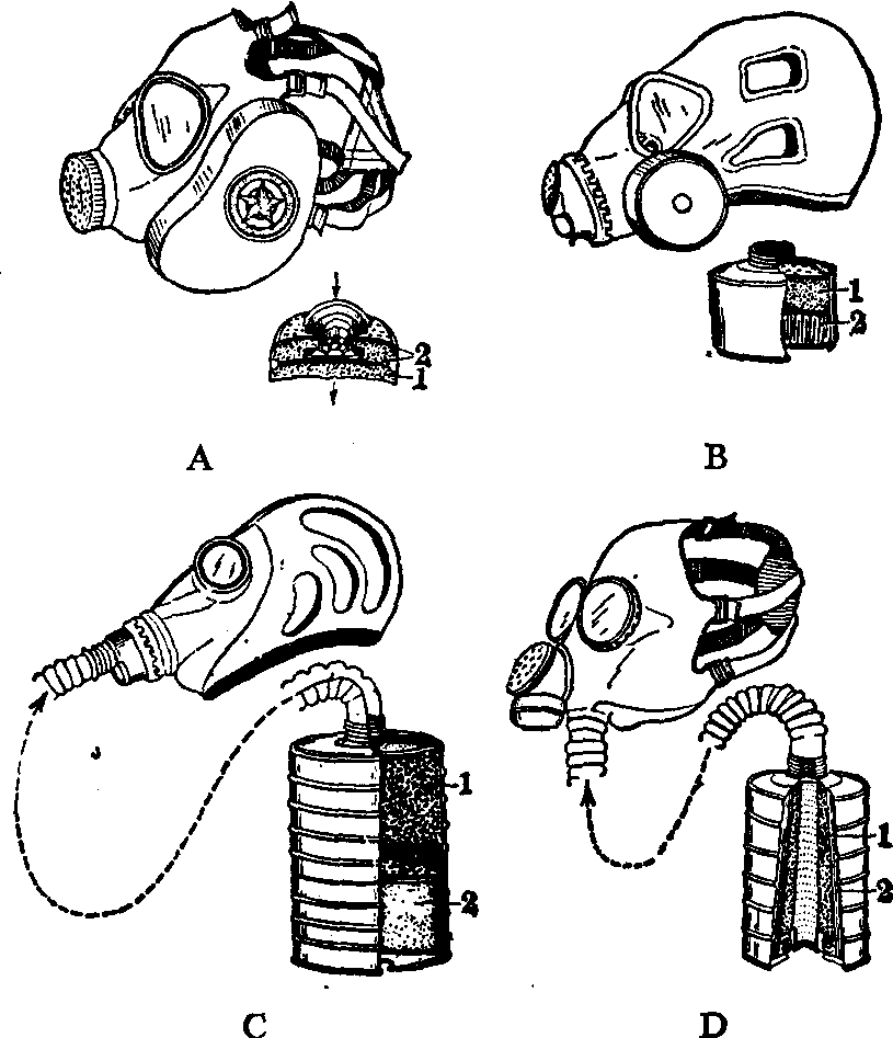 氧化罐可连接在滤毒罐上以专门用于防护一氧化碳中毒。通常在坦克内、火炮工事内,或一氧化碳浓度较高的环境中,均可使用氧化罐。氧化罐罐内装填物有两层,上层为催化剂,下层是干燥剂(图1)。催化剂系用二氧化锰和氧化铜混合加工制成。其作用是使一氧化碳与空气中的氧反应,生成无毒的二氧化碳; 干燥剂是一种浸氯化钙的活性炭,用于吸收水分,保持催化剂干燥。 面罩 作为隔绝呼吸器官和外界污染空气之用,还能保护眼和面部皮肤,免受毒剂、放射性灰尘或致病微生物的直接伤害或侵入,保证过滤的洁净空气进入呼吸器官。面罩由眼窗、吸气活门、呼气活门和保明装置等组成。有些面具的滤毒罐直接与面罩相接(图2A、图2B),或者在面罩之间用导气管连接(图2C、图2D)。 面罩有头盔式面罩与头带式面罩之分。 59型头盔式面罩分为五种尺码(0~4号),69型头盔式面罩有四种尺码(1~4号),号码标在面罩的左下方。 64型和65型头带式面罩各分为三种尺码 (1~3号,或大、中、小三种),号码印在面罩下头带调节环前的橡皮上。可按每人的面长和面宽尺寸选配面罩号码。 面具袋 用以来存放和携带防毒面具。 过滤式防毒面具使用 在使用防毒面具时,由于面具的呼吸阻力、有害空间和面罩的局部作用,对人体的正常生理功能造成不同程度的影响。在平时健康人员对这些 图1 氧化罐 图2 过滤式防毒面具外观 正确使用防毒面具主要包括选配面具和佩戴面具两个环节。选配头盔式面罩时,务使面具不漏气,又不致过紧,以免压痛头、面部。 目前使用的几种面具的佩戴方法基本相似,事先应对有关人员进行严格的训练,做到动作熟练正确。 外军防毒面具 苏军目前装备有过滤式防毒面具以及头部伤员面具等。美军现阶段装备有过滤式防毒面具以及头部伤员面具等。有的型号是一种头带式面具,滤毒罐(或滤过元件)安放在面罩的左右两颊部。面罩上有通话器、阻水罩、饮水管和复苏器等。戴上这种防毒面具后,人员可在染毒区从军用水壶中吸水喝或进行口对口人工呼吸。面具全重约900g。头部伤员面具是用一种带有过滤毒剂材料的丁基胶布制成的头罩。头罩上装有眼窗。另外,美军还装备有专供飞行员使用的防毒面具和专供坦克乘员使用的防毒面具。美军正在研制各军、兵种通用的防毒面具。其他一些国家的军队均装备有各种型号的防毒面具。 许多国家也都备有专门的民用防毒面具和工业用防毒面具,战时也可用来防御化学战剂。一些国家还专门设计有供不同年龄的婴儿和儿童用的防毒面具。 ☚ 化学战剂防护器材 隔绝式防毒面具 ☛ |