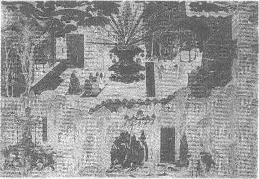 初唐。纵132厘米,横188厘米。甘肃省敦煌县莫高窟第323窟南壁东侧中层壁画。此图描绘的是隋开皇六年天大旱,隋文帝请昙延法师求雨的情形。图分两层,下层为隋文帝在群臣的簇拥下请昙延法师的场面,文帝的神态和动作都流露出恭敬。左侧绘几个舆夫抬着肩舆行进在山路上。舆内的昙延法师沉稳、自信。舆夫行走的跨步很大,脚步如飞,以示祈求降雨的急切心情。画面的上层巍然高耸的城墙内有庙宇和放光的舍利塔。庙前,文帝受戒求雨。塔前的经篷内法师在与文帝说涅槃经。空中乌云密布,象征降雨,以示祈雨的灵验。此图画面简洁概括,人物的形态、动作与情节发展十分相符,生动传神。作者使用石绿、红褐色晕染,绘城外重叠的翠山,将画面点缀得很美丽。