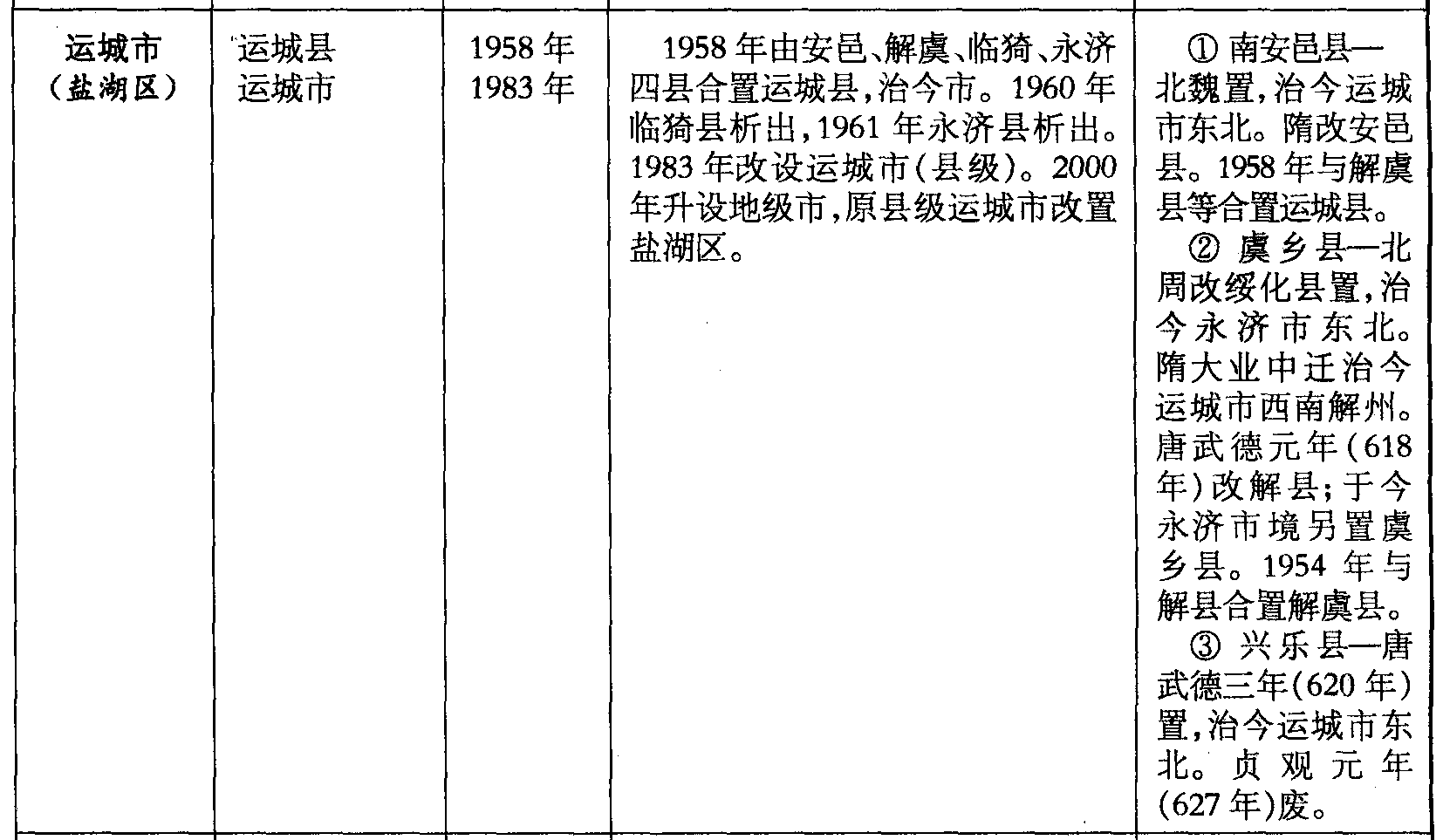 1958年由安邑、解虞、临猗、永济四县合置运城县,治今市。1960年临猗县析出,1961年永济县析出。1983年改设运城市(县级)。2000年升设地级市,原县级运城市改置盐湖区。