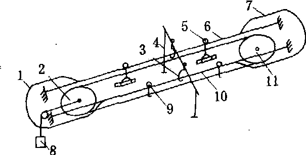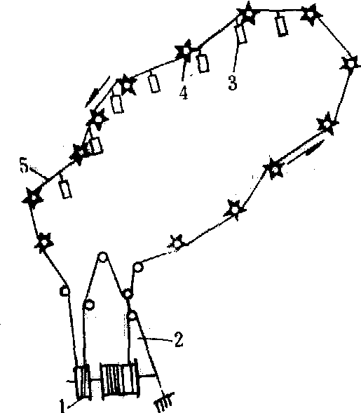 释义 | 运材架空索道skyline for log transport利用在架空承载索上运行的跑车(见集材架空索道)进行运材的设备。通常与汽车运材相衔接,多用于山高坡陡、地势起伏大、汽车道难于修建或修建费用过高的地区。索道长为1~5公里。运材架空索道有双线循环式和单线循环式两类。 图1 双线循环式运材索道 图2 单线循环式运材索道 单线循环式运材索道 也称曲折式索道。由循环牵引索、挂钩、齿形导向滑车和绞盘机等组成(图2)。适于单株材积在0.5立方米以下的原条集材,平均坡度在20°以下,最大不得超过24°。水平转折角8°~130°,双钩载重量为100~120千克,安装拉力为4.5~5千牛。齿形滑车的安装高度为2.5~3米。动力采用8~11千瓦的双筒摩擦式绞盘机。台班产量可达15立方米,为中国的一种新型索道。其关键设备为挂钩和齿形滑车。挂钩用绳索缠在牵引索上后被锁钩钩住。只要向上推动锁杆,即可使挂钩连同绳索从牵引索上脱落。齿形滑车能使牵引索连同挂钩顺利绕过。为此,每一齿的齿根必须与滑车轮槽底相切,使捆木索保持垂直方向通过滑车。 |