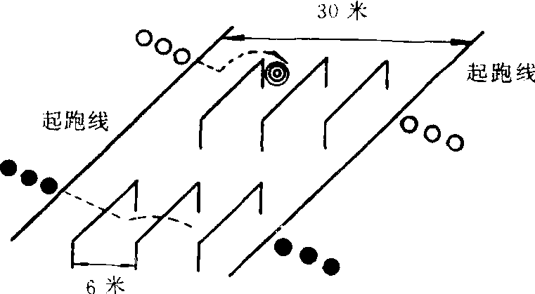 场地 在操场或空地上画两条相距30米的平行线为起跑线,线之间每隔6米放1个栏架,每队放置4个栏架。